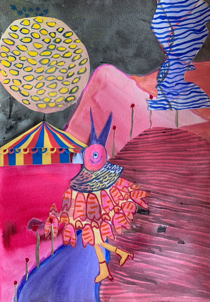 My paintings start with a hunch or inclination. It is as if I am in a playground with the toys as tools at my disposal to do with as I see fit. I take on the role of the dreamer or child when I set out to make a painting. To me the surface of the canvas is like a stage which I play on as I transform myself into different characters or objects depending on the scene depicted. I relate to the painter Paula Rego when she says her studio is like a playroom, ” a self-contained enclosure within the boundaries of which anything is permissible and possible.”